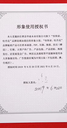 “牡丹花”“怡飾家”品牌是公司主營的注冊商標,并與明星句號達成合作。14年的板材專業(yè)精神和持續(xù)穩(wěn)健的行業(yè)資源優(yōu)化整合。